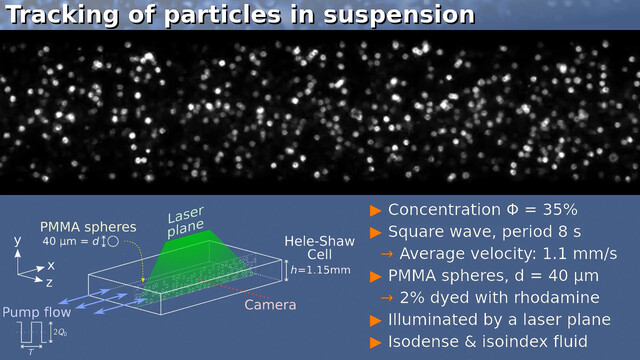 I am researching the flow through narrow channels of viscous fluids with solid particles suspended inside. Such fluids are called suspensions and can be found in a variety of industrial applications (transport though pipes, microfluidic devices) and also in nature (blood, contaminants in groundwater, landslides). At the lab, we perform experiments with a model system made with plastic spheres and aqueous solutions, visualizing and tracking the particles using a software I have written in C and Python programming languages.